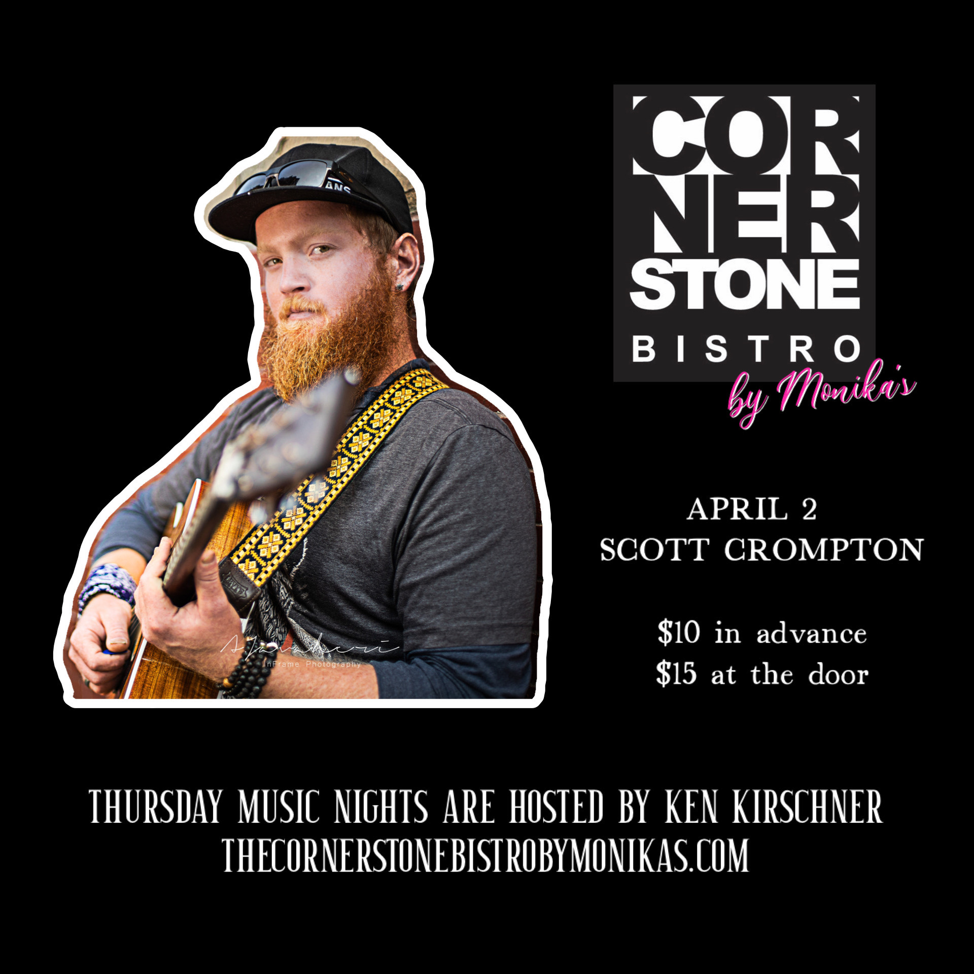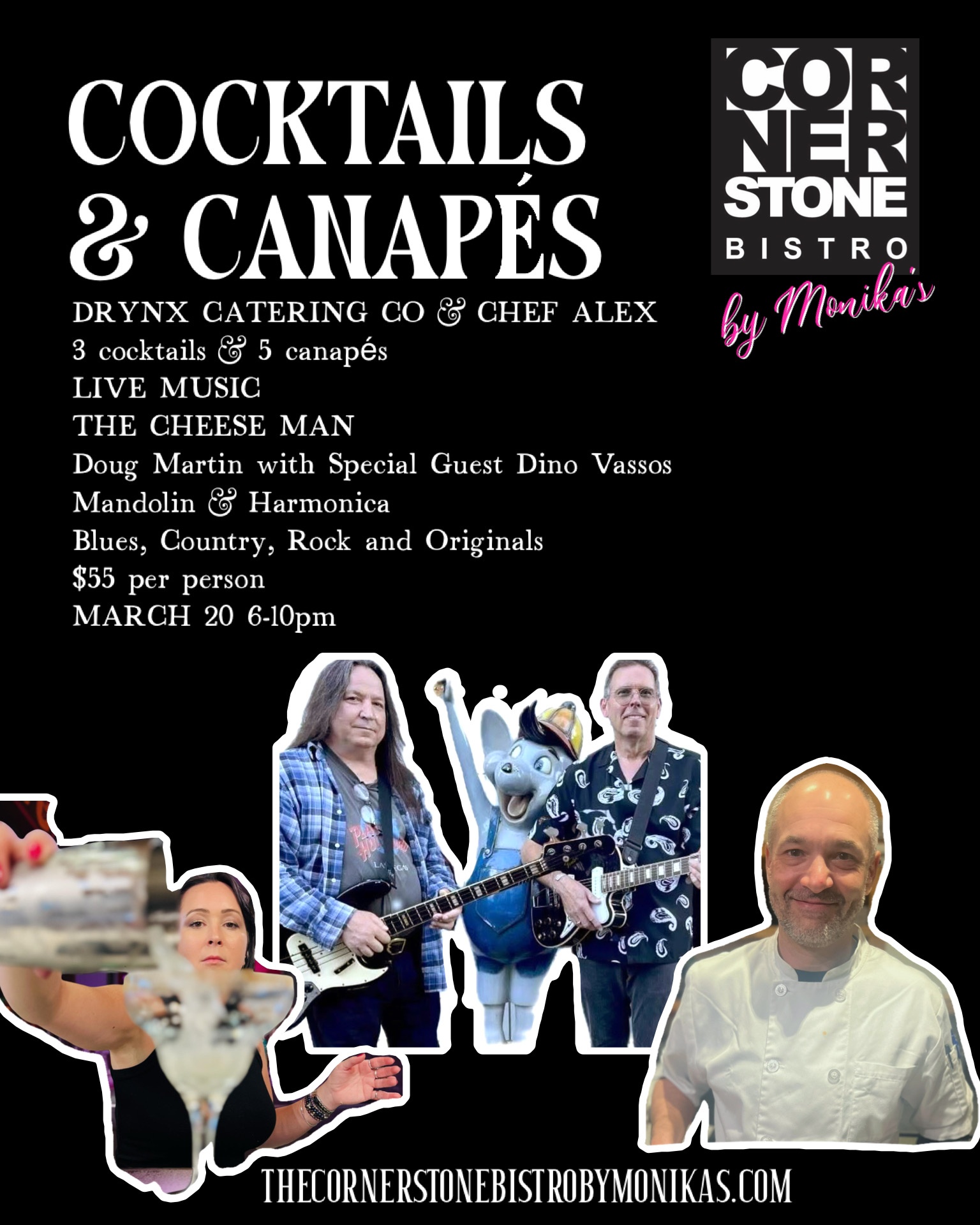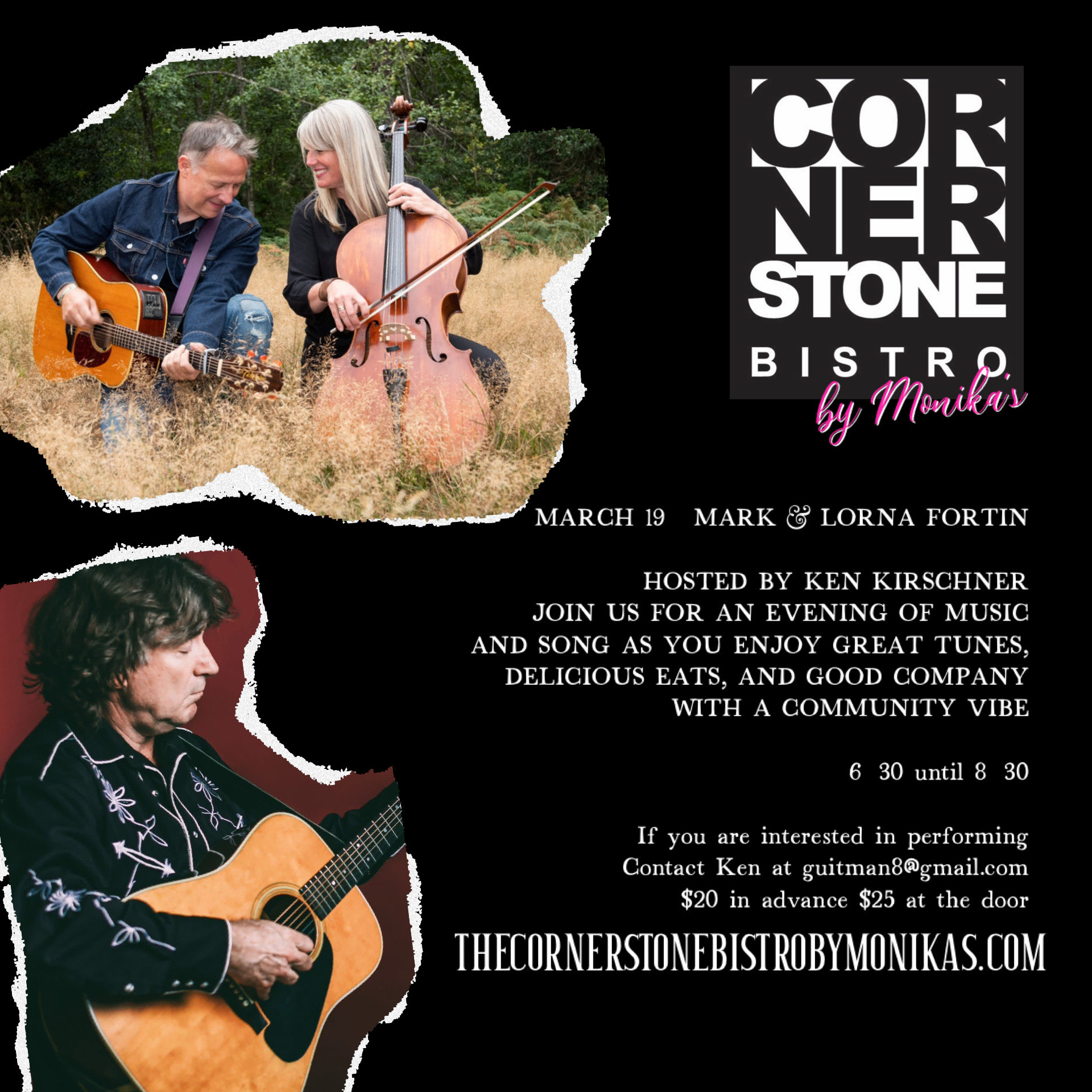 RESERVATIONS FOR MUSIC NIGHT ARE ALL ONLINE. PLEASE CHECK OUT ONLINE TO BOOK YOUR GROUP. WALK INS ARE NOT GUARANTEED. PLEASE NOTE THAT YOUR RESERVATIONS FOR MUSIC NIGHT ARE FOR 5:45PM, 6PM AND 6:15PM. WE WILL MESSAGE YOU YOUR RESERVATION TIME AFTER BOOKING. WE WILL HOLD YOUR RESERVATION FOR 15 MINUTES AT WHICH POINT IF YOUR PARTY HAS NOT ARRIVED, WE WILL MOVE TO THE WALK INS. IF YOU ARE RUNNING LATE OR PLANNING TO COME LATER, PLEASE EMAIL US AT THECORNERSTONEBISTROBC@GMAIL.COM